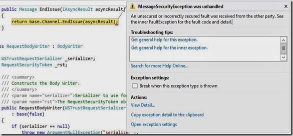 "An unsecured or incorrectly secured fault was received from the other party. See the inner FaultException for the fault code and detail."